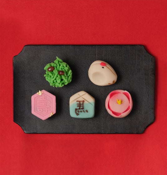 紅梅・若松・鶴・亀など、新年を華やかに彩るお年賀にふさわしい上生菓子を詰め合わせました。