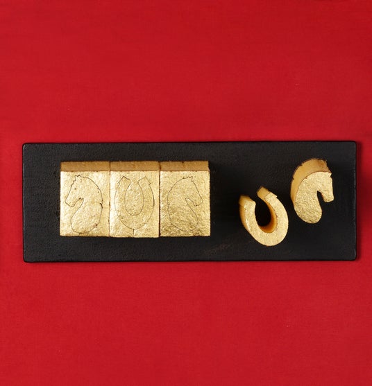 かすてらの表面に余すところなく金箔を貼り付けたこの上なく贅沢な逸品です。その金かすてらに、2026年の干支をモチーフに「馬と蹄鉄(ていてつ)」のカットを施しました。年の初めの手土産にぜひどうぞ。