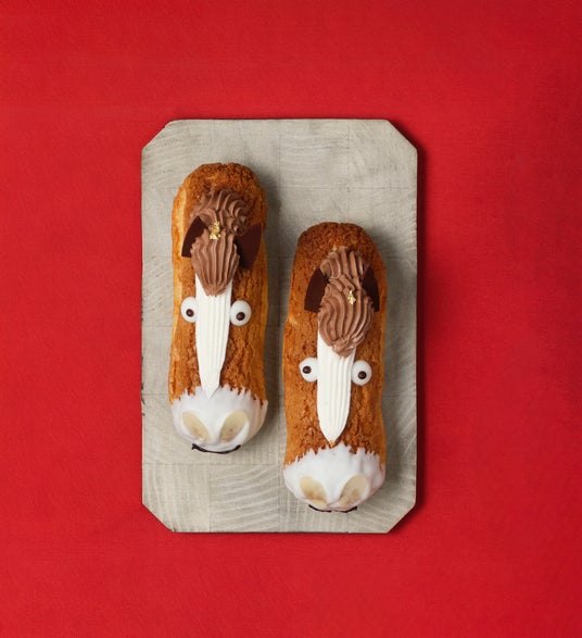 干支の「午」に因んだ縁起の良い当て字として行事や商売の成功を願う時に使われる「馬九行九( うまくいく)」。りんごのコンポートが入ったマスカルポーネクリームのエクレアで表現しました。2026年も皆さまにとって良い年でありますように。