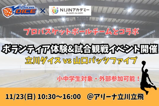 株式会社NIJIN(本社:東京都江東区、代表取締役:星野達郎)が運営する不登校オルタナティブスクール『NIJINアカデミー』は、立川市を拠点とするプロバスケットボールチーム『TACHIKAWA DICE』と連携し、不登校の子どもたちが試合運営ボランティアとして参加するキャリア体験イベントを、2025年11月23日(日)にアリーナ立川立飛で開催します。