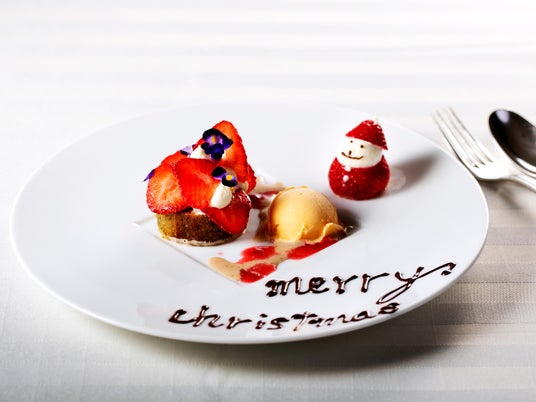 デザートには、濃厚なフォンダンショコラとパッションフルーツガナッシュ、苺のサンタを添えたピスタチオアイスをご用意。大人の遊び心と華やかさを兼ね備えた、クリスマスならではの一皿です。