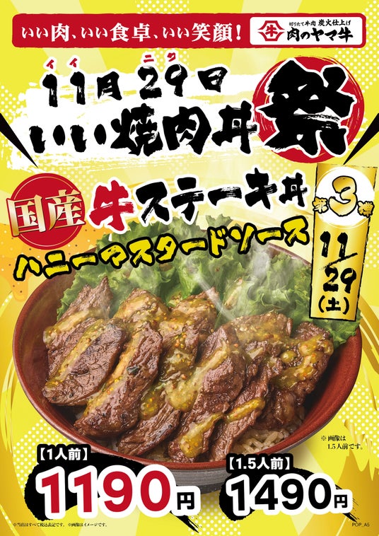 株式会社肉のヤマ牛(本社:東京都渋谷区、代表取締役社長:池ノ上 達也)が展開する、食の感動体験を追求し、切りたて・焼きたてにこだわる炭火仕上げ肉のヤマ牛は、全国各店舗にて2025年11月29日(土)限定で、 11月最後の“11(いい)やき29(にく)丼祭り”を開催します。第3弾として、大変好評をいただいている『国産牛ステーキ丼』を29日(土)の1日限定で特別価格で販売いたします。今回は、新たな味わいの提案として“ハニーマスタードソース” をご用意いたしました。はちみつの甘みとコク、マスタードのスパイシーさ、そしてニンニクのパンチが絶妙に絡み合い、切りたて、焼きたての香ばしい牛ステーキと白米がとまらぬ一杯に仕立てました。