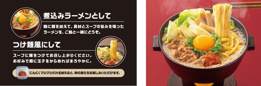 また、本商品は、鍋に麺を加えて、具材とスープとともにしっかり煮込んだ「煮込みラーメン」としての食べ方、そして、スープに麺をくぐらせて、そこに玉子も絡めた「つけ麺風」の食べ方の2通りをご提案しており、それぞれで異なる麺の食感、温度、味わいをお楽しみいただけます。さらに、別添の「にんにくマシマシだれ」を加えれば、パンチの効いた味変も可能。その日の気分や食べ進め方に合わせて、自分好みの一杯が仕上がります。