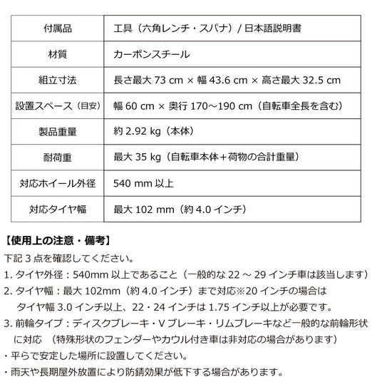 ※・20インチ車はタイヤ幅3.0インチ以上に対応。 (20インチ車のうち、一般的な折りたたみ自転車・小径電動アシスト車の多くはタイヤ幅2.0~2.5インチのため、標準仕様では非対応です。 カスタマイズで3インチ以上の太めタイヤを装着している場合は対応可能です。)