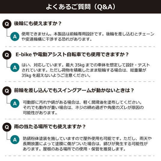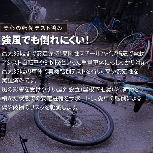 最大35 kg(自転車本体+荷物の合計重量)※荷物を載せたまま駐輪する場合、35 kgを超えないよう注意。 ※できるだけ荷物を外した状態で駐車することを推奨。
