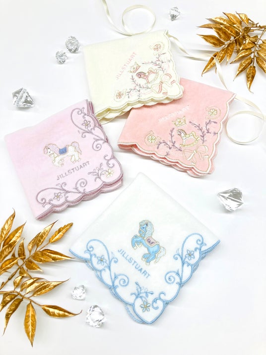 キラキラとした馬のアップリケ刺繍や、馬蹄・リボン・四つ葉のクローバーなどのラッキーモチーフが入った馬のデザインを取り入れた、新春にふさわしい華やかなタオルハンカチ。
