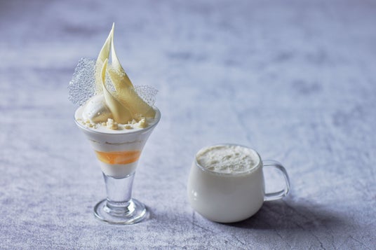 雪の軌跡を表現したパフェとホットドリンク