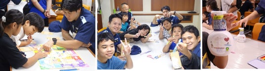また「おくちからだプロジェクト」では、オーラルヘルスケアの紙芝居でケアのポイントを学んだあと、宮古島海上保安部のみなさんと一緒に、「はごろく」ゲームや「デコ歯ブラシ」、『キレイキレイ薬用泡ハンドソープ』のボトルにオリジナルラベルを貼る「マイキレイキレイボトル」の工作に取り組みました。