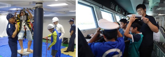 宮古島海上保安部に協力頂き、海難救助の体験やセーラーキャップを被って船内見学を行いました。
