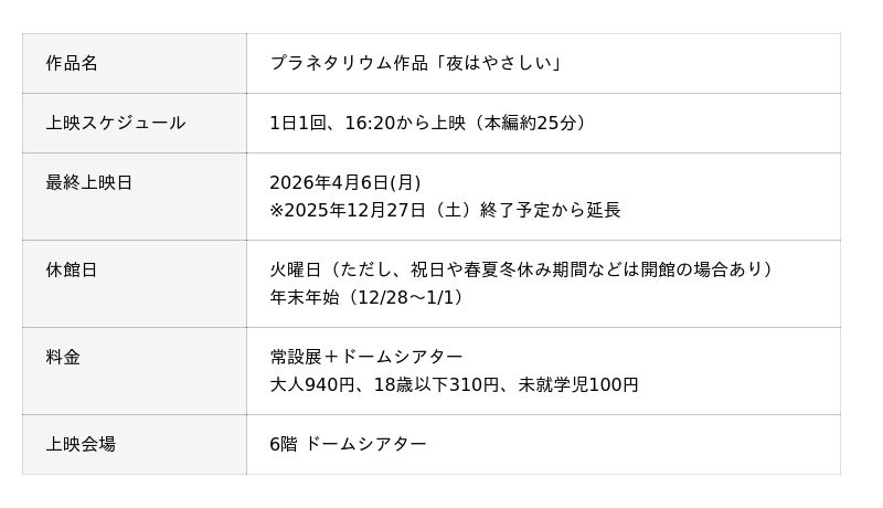 日本科学未来館(略称:未来館 館長:浅川智恵子)は、谷川俊太郎さんが自ら手がけた唯一のプラネタリウム作品「夜はやさしい」の上映期間を、2026年4月6日(月)まで延長します。本作は谷川さん原案のプラネタリウム作品として2009年から約7年間にわたり未来館で上映していたものです。2025年7月から12月末までの予定で再上映をしていましたが、このたび好評につき、上映期間を延長することとしました。