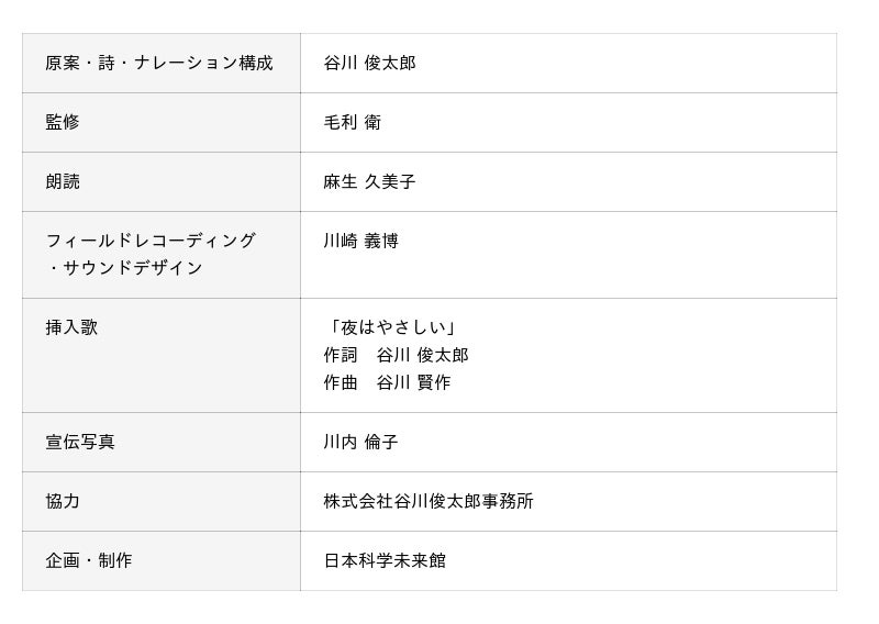 世界の6つの地域(アジア、ヨーロッパ、アフリカ、南アメリカ、北アメリカ、オーストラリア)のある夜の様子を、プラネタリウム投影機「MEGASTAR-II cosmos (メガスターツー コスモス)」によるリアルな星空と、フィールドレコーディングで収録された各地のリアルな環境音で再現。谷川さんの書下ろしを含む自選の詩に導かれながら、世界の夜を旅していきます。あたかもその夜、その場にいるような感覚を通して、人々が星の下でさまざまな思いをめぐらせてきた“夜”という時間をとらえ直し、地球と宇宙の広がり、そしてその中にいる自分の存在を改めて感じられるプラネタリウム作品です。