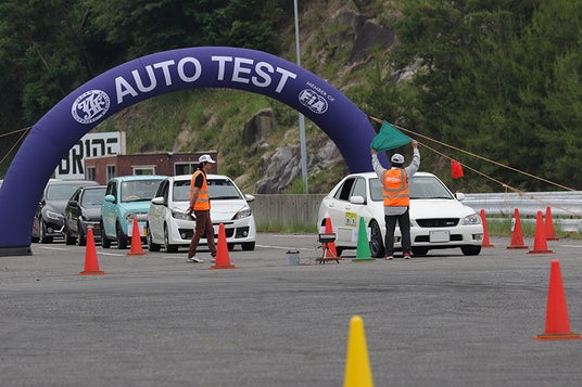 オートテストという競技は「運転の正確さ」を競う新しいスポーツで、パイロンで設定したコースを1台ずつ走って、減点が最も少なかった人が優勝となり、パイロンに接触したり、コースを間違えるとペナルティが加算されていきます。
