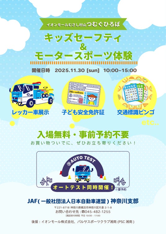 JAF(一般社団法人日本自動車連盟)神奈川支部(支部長・高木恵一)は、11月30日(日)に「キッズセーフティ&モータースポーツ体験ひろばイベント」を、イオンモールむさし村山つむぐひろば(東京都武蔵村山市)にて開催します。