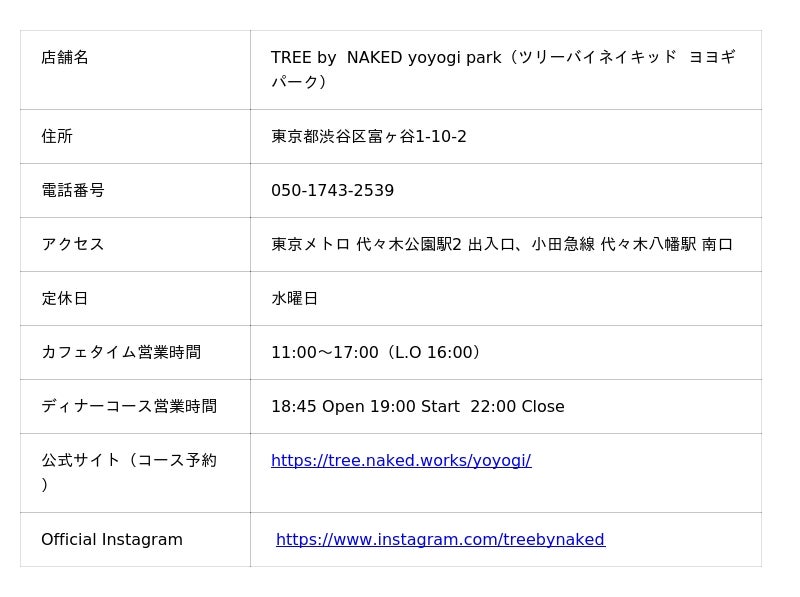 株式会社ネイキッド(英語表記:NAKED, INC. 所在地:東京都渋谷区 代表:村松亮太郎)が手がける、代々木公園のアートレストラン「TREE by NAKED yoyogi park」(ツリーバイネイキッド ヨヨギパーク)は、2025年11月20日(木)~12月25日(木)まで、ホリデーシーズン限定メニューを販売いたします。また、本年12月25日(木)をもちまして現店舗での営業を終了し、来春に新店舗への移転が決定いたしましたことをご報告いたします。