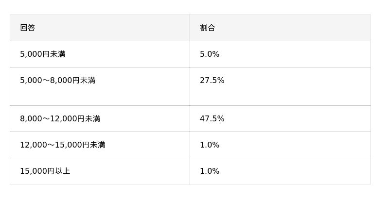 東京でルメッカを1回受けた際の費用については、「8,000円~12,000円」と回答した人が全体の約半数を占め、最も多い結果となりました。さらに「5,000円~8,000円未満」と答えた層を含めると全体の75%に達し、比較的リーズナブルな価格帯で施術を受けている人が多いことがわかります。