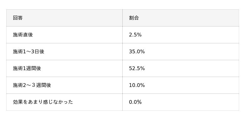 施術後1週間以内に効果を実感したと回答した人は全体の9割に達し、非常に高い割合となりました。また、効果をほとんど感じなかったと答えた人は0%で、施術後の好ましい変化が見込めます。