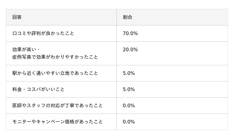 クリニック選びで重視した点として最も多かったのは「口コミや評判が良かったこと」で、全体の7割を占めました。口コミには実際の施術体験者による具体的な感想が掲載されていることが多いため、判断材料として活用するとより安心して選べるでしょう。