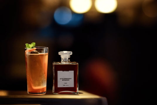 艶やかな深紅のリキュールは、まるで香水のような佇まいのガラス瓶に満たされて。