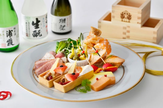 呑み比べをお楽しみいただける日本酒3種は、冷酒 大七生酛300ml・純米酒 浦霞300ml・純米大吟醸 獺祭180mlをご用意、お正月風にアレンジした「フレンチオードヴル」をセットで、ルームサービスにてお届けします。