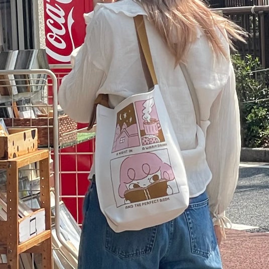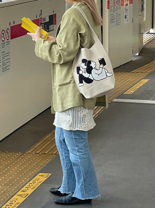Fourty同様読書をしているイラストや、ホットドリンクを飲んで一息ついているイラストが、癒される作品です。シンプルな配色とイラストが特徴なのでどんな服装にも馴染みます。