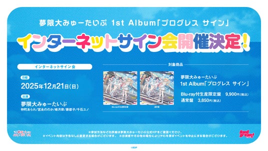 12月21日(日)に、夢限大みゅーたいぷ 1st Album「プログレス サイン」リリースを記念したインターネットサイン会の開催が決定しました。