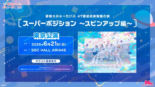 2026年6月21日(日)にSGC HALL ARIAKEにて、夢限大みゅーたいぷ 47都道府県制覇の旅「スーパーポジション ~スピンアップ編~」東京公演の開催が決定しました。夢限大みゅーたいぷの単独公演として過去最大規模の公演となります。