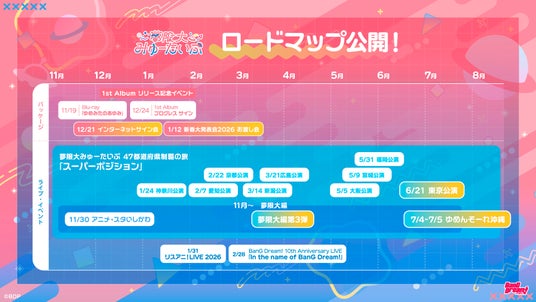 株式会社ブシロードミュージック(本社:東京都中野区、代表取締役社長:北岡那之) は、バンドリ!プロジェクトの新バンド「夢限大みゅーたいぷ」(通称:ゆめみた)が、11月20日(木)にデビュー2周年記念生配信にて公開した、47都道府県制覇の旅「スーパーポジション」や今後の活動に関する新情報についてお知らせいたします。