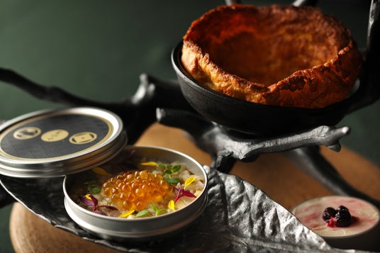 淡白で上品な旨味が特徴の大岩魚(おおいわな)をマリネし、フルーティーな香りを楽しめる林檎のチップで瞬間燻製したタルタルに仕立てました。大岩魚のタルタルには瑞々しい食感の林檎を合わせ、爽やかな口当たりを楽しめます。スキレットで焼き上げたダッチベイビーに、大岩魚のタルタルと赤スグリを加えたサワークリームを合わせて、コースの始まりを彩ります。