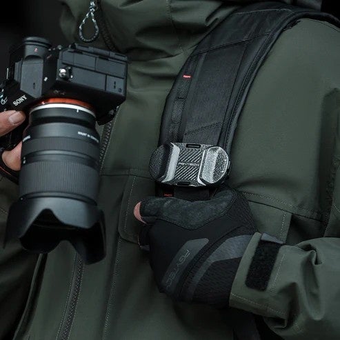ベルトやバックパックのショルダー部分に取り付けて、カメラを持ち運ぶことができます。アルカスイス互換プレートの95%に対応し、耐荷重は最大30kgまでで、カメラの安全な持ち運びを実現します。