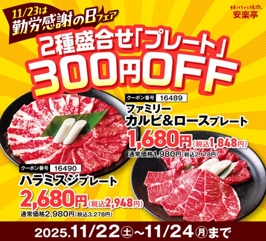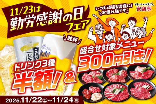 焼き肉レストラン「安楽亭」(本社:埼玉県さいたま市)は、2025年11月23日の勤労感謝の日に合わせ、「勤労感謝の日フェア」を11月22(土)~24日(月)の3日間限定で開催します。