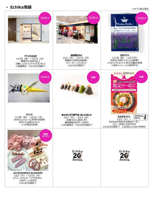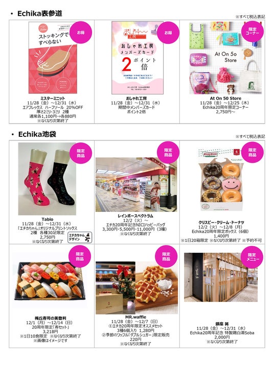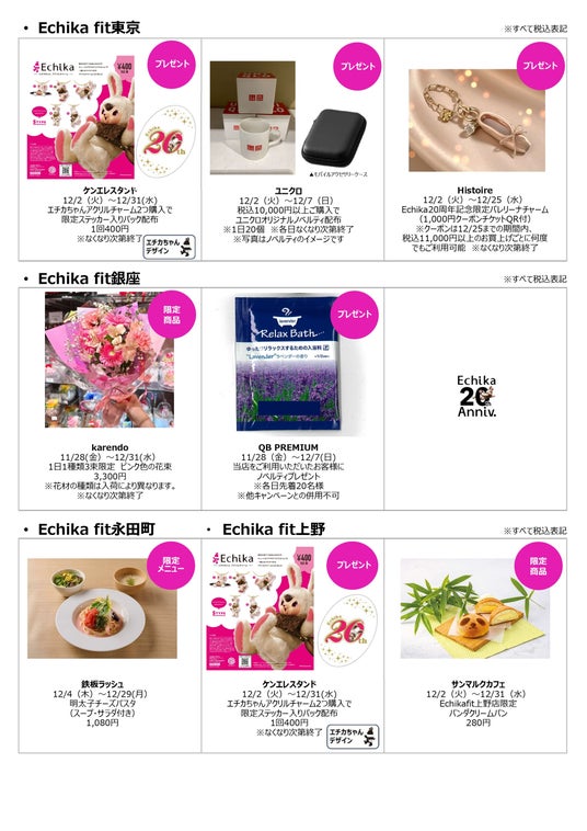 20周年を記念して、エチカちゃんデザイン商品をはじめ、期間限定商品や限定メニュー、限定サービスをEchikaの各施設、各店舗にて販売いたします。