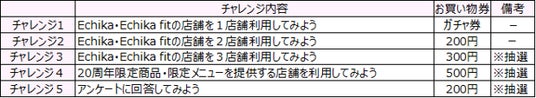 各店舗をご利用時に二次元コードを読み込むと、LINEミニアプリ上でチャレンジ達成に必要なスタンプがもらえます。スタンプを集めてチャレンジを達成すると、もれなく200円のデジタルお買物券を進呈。チャレンジ内容に応じた賞品を抽選でプレゼントいたします。さらに今回は、20周年を記念しエチカちゃんオリジナルグッズがもらえるガチャガチャの参加券もプレゼント!