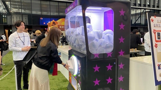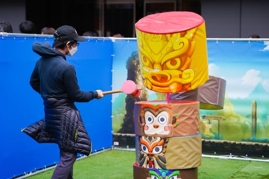 巨大「メイプルキノコ」「ピンクビーン」「イエティ」が出迎える会場中央のメイプル広場では、スタンプラリーとミニゲームを行いました。ミニゲームはゲーム内のコンテンツをモチーフとした、だるま落としの要領でトーテムを打っていく「TOTEM PANG!PANG!」や射撃ゲーム「天狗狩り」、5つの剣の中から長剣を探し出す「長剣探し」を設置し、多くの方に楽しんでいただきました。ミニゲームとスタンプラリーに参加したあとは、様々な賞品が当たるリアル「メイポン」ガチャにチャレンジいただきました。