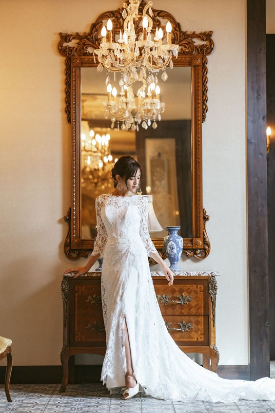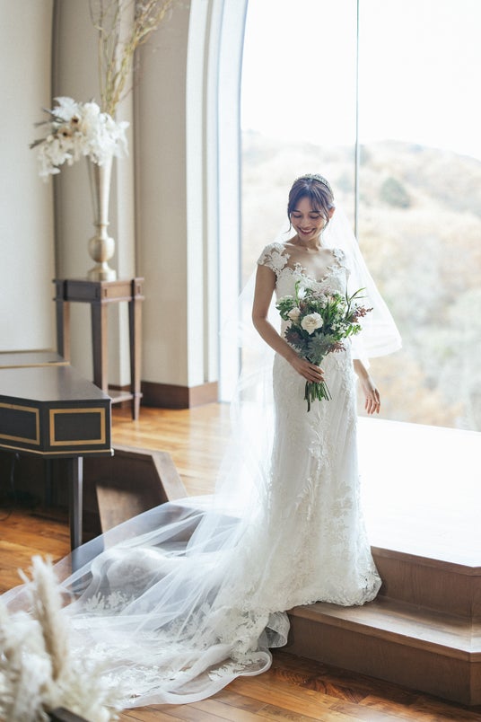 シャンテリーレースと立体的なマクラメレースを重ねた優美なマーメイドドレス。柔らかなチュールが描くロングトレーンには、花々の刺繍が広がり歩くたびにエレガントな余韻を残します。