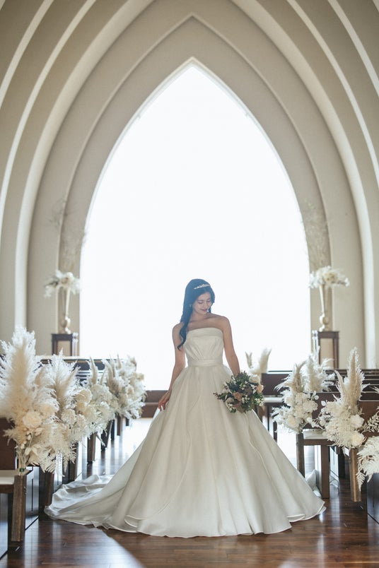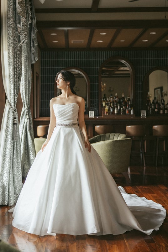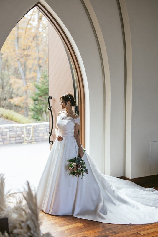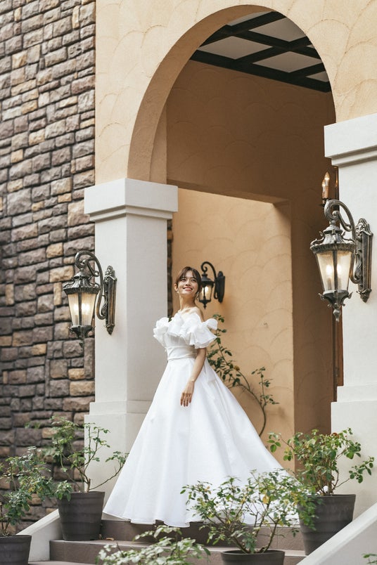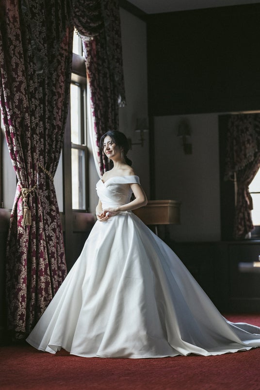 気品あふれるオフショルダーと計算されたドレープが胸元を飾るデザイン。優美に広がるボリューム感のあるスカートが至福の一日を彩る映画のヒロインのような印象的な美しさを届けます。