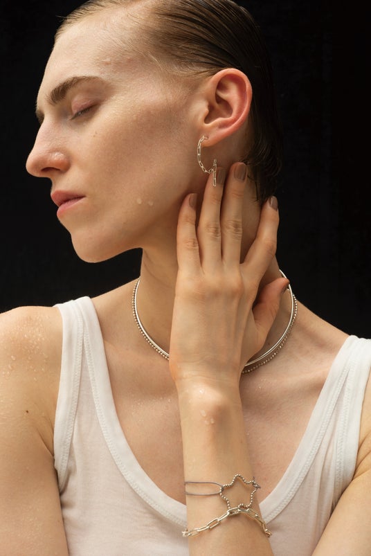 チェーンの構造美と流動性をテーマに、シルバーが持つ造形の自由度を最大限に引き出しています。
