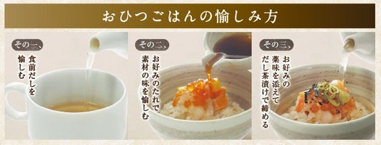 『おひつごはん四六時中』は、北海道産昆布と枕崎産鰹節の旨味が凝縮された特製だしを、先ずは「食前だし」として味わい、ほっと一息つけるひとときを感じていただいた後に、海鮮を中心とした「おひつごはん」を味わっていただき、最後に“締めのだし茶漬け”を愉しんでいただくお店です。また、だし茶漬け専門店として、だし茶漬けに最適な“会津産こしひかり”を主とした国産米に「押し麦」をブレンドしたオリジナルの『茶漬け米』を採用するなど、新たな取り組みを導入しております。