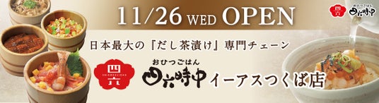 日本最大のだし茶漬け専門チェーン『おひつごはん四六時中』を運営する株式会社イオンイーハート(所在地:千葉県千葉市、代表取締役社長:奥野善徳、以下当社)は、11月26日(水)茨城県つくば市「イーアスつくば」レストランアベニューに「おひつごはん四六時中 イーアスつくば店」をオープンいたします。