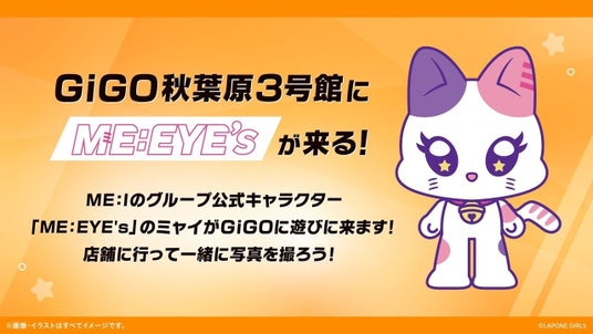 GiGO秋葉原3号館に、ME:Iのグループ公式キャラクター「ME:EYE‘s」のミャイが登場します。日程など、詳細については「GiGOグループのお店公式X」アカウントで発信いたします。