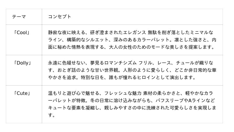 本コレクションは、時代を先取る最新のトレンドを取り入れながら、一人ひとりの個性を最大限に活かし、輝かせるために、細部にまでこだわった情熱的で革新的なデザインが特徴です。【洋装】新たな美意識を纏う3つのテーマ