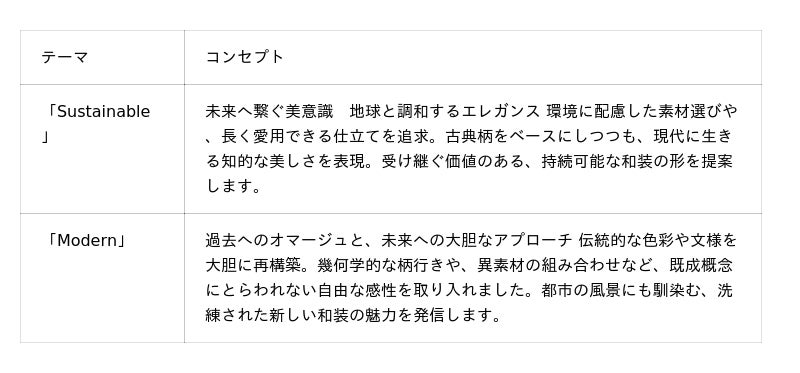 受け継がれてきた染めと織りの技術に、現代のライフスタイルと価値観を吹き込みました。変わらない日本の美意識と、進化するファッションの感性が響き合い、着物のもつ可能性が大きく広がります。