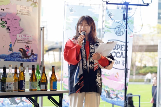 続いてはゲストとして、高知の日本酒文化を熟知するスペシャリスト“土佐酒アドバイザー”の森裕子さんがご登壇。ステージには大きな高知県の地図がセットされ、高知の北から南まで、個性あふれる酒蔵の魅力を語りました。森さんはブースに勢ぞろいした日本酒について、「高知のお酒は、県内の川を流れる良質な軟水を使った辛口の味わいが魅力。また最近では、高知の酵母を活かしたフルーティーな香りが特徴のお酒もあります。みなさん、待ちゆうきね~!」とコメントし、会場内の「土佐酒市場」をPRしました。