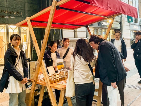 自然共生サイト米、唐津ミツバチプロジェクトのニホンミツバチ蜂蜜を九州大学の学生や唐津南高校卒業生とともに展示・販売
