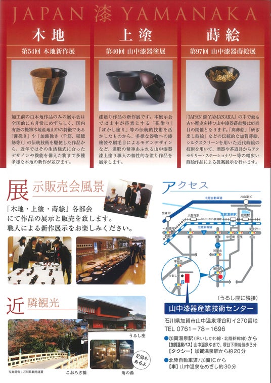 山中が得意とする花塗りや色塗りなど、多彩な漆技法による新作塗り作品を展示。伝統を基盤にしつつ、デザイン性や独自性を追求した漆上塗り職人の新たな表現が紹介される。・第97回 山中漆器蒔絵展