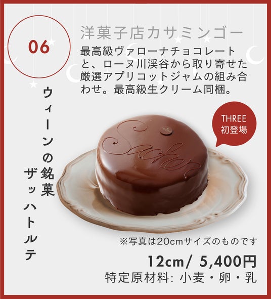 ウィーンの銘菓 ザッハトルテ/12cm/5,400円(税込)洋菓子店カサミンゴーより、自慢のザッハトルテが【THREE初登場】。