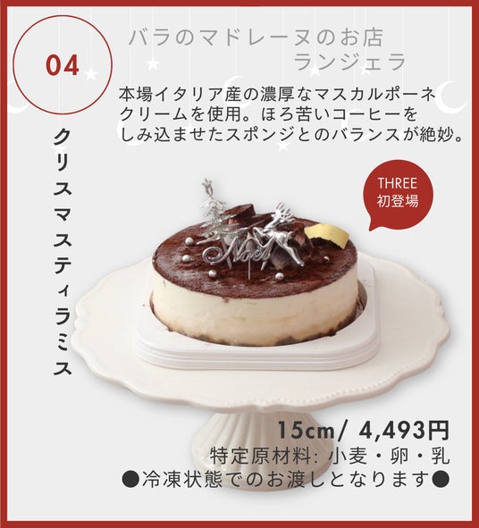 クリスマスティラミス/15cm/4,493円(税込)ランジェラのメルティローズシリーズに、本格ティラミスが仲間入り。