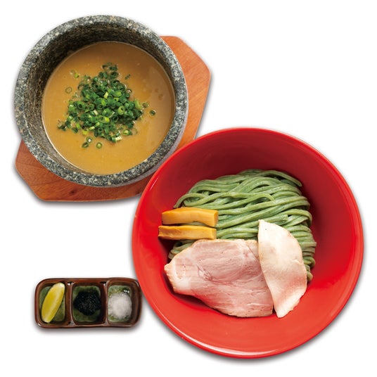 国産小麦の極太麺に国産海苔を、麺が緑色になるくらいふんだんに練り込んだ特製麺です。すだちや岩塩、海苔醤油を添えることで、繊細な味の変化を楽しめます。