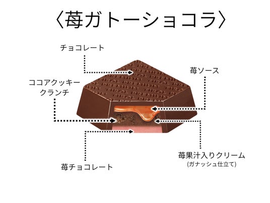 甘酸っぱい苺ソースがアクセントに♪苺果汁入りクリームとココアクランチクッキーで本格的な苺ガトーショコラの食感を再現!ちょっとした休憩時間をプチ豪華にするプレミアムな一粒に仕立てました!