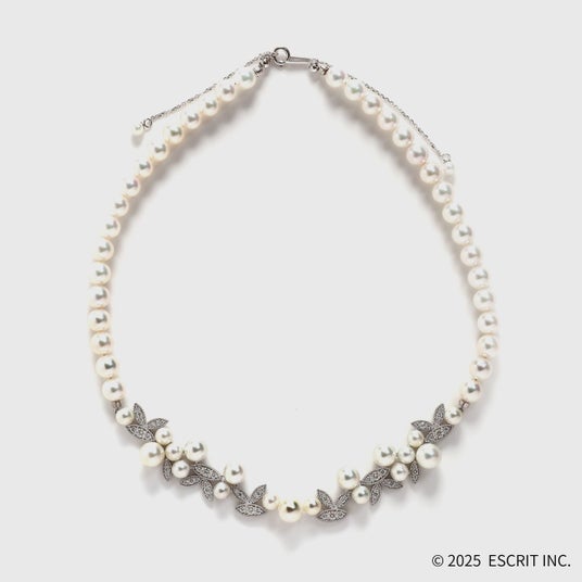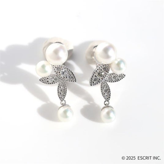 若葉に宿る朝露を思わせる柔らかな輝きを湛えたあこや真珠をあしらい、そこにダイヤモンドの繊細な光が重なり、花嫁の装いに上品な華やかさを添えています。
