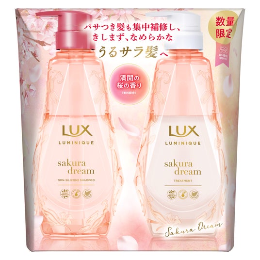 ラックス ルミニークは、毎日忙しい生活の中でバスタイムを贅沢な時間にしたいと考えている女性に向けた、きしまないノンシリコンシャンプーシリーズ※6です。サクラドリームシリーズではその名にふさわしい満開の桜を彷彿とさせる華やかな香りで、乾燥や花粉による春のパサつきを抑えつつ、潤いのあるさらさらとした髪へと導きます。